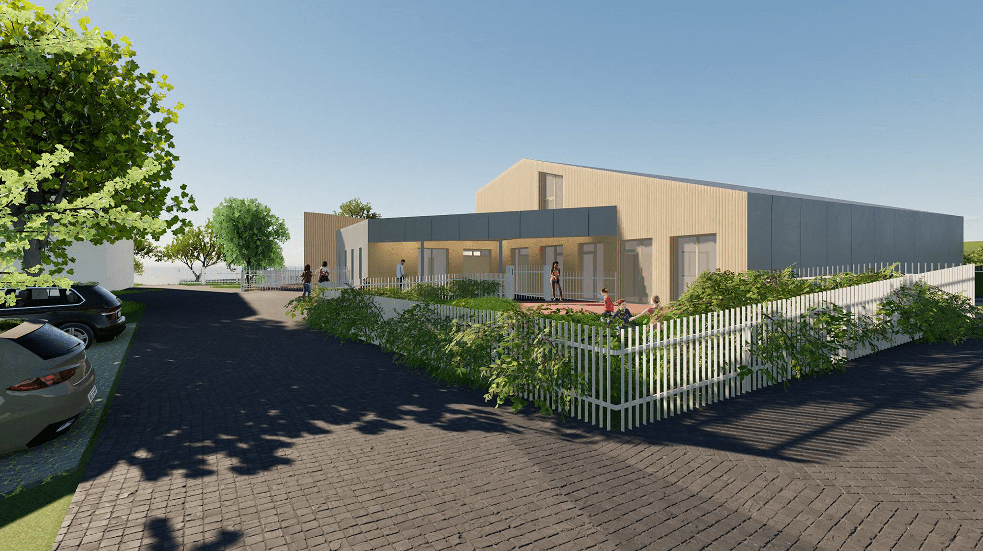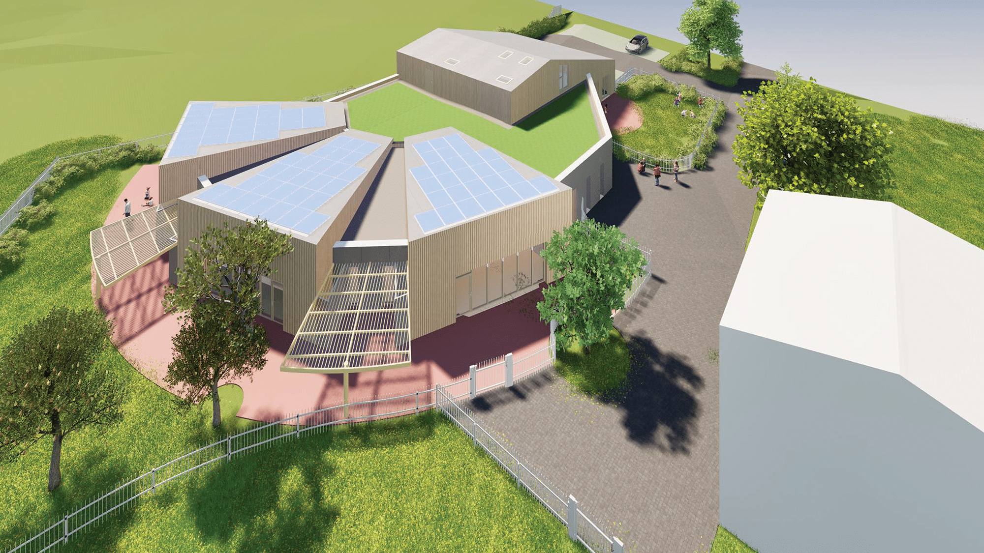 Pour la création du nouveau bâtiment, la première volonté a été d’implanté le projet sans impacter les arbres existants. La cour du Relais Petite Enfance, la cour pour les salles d’activités et le verger seront des espaces délimités.