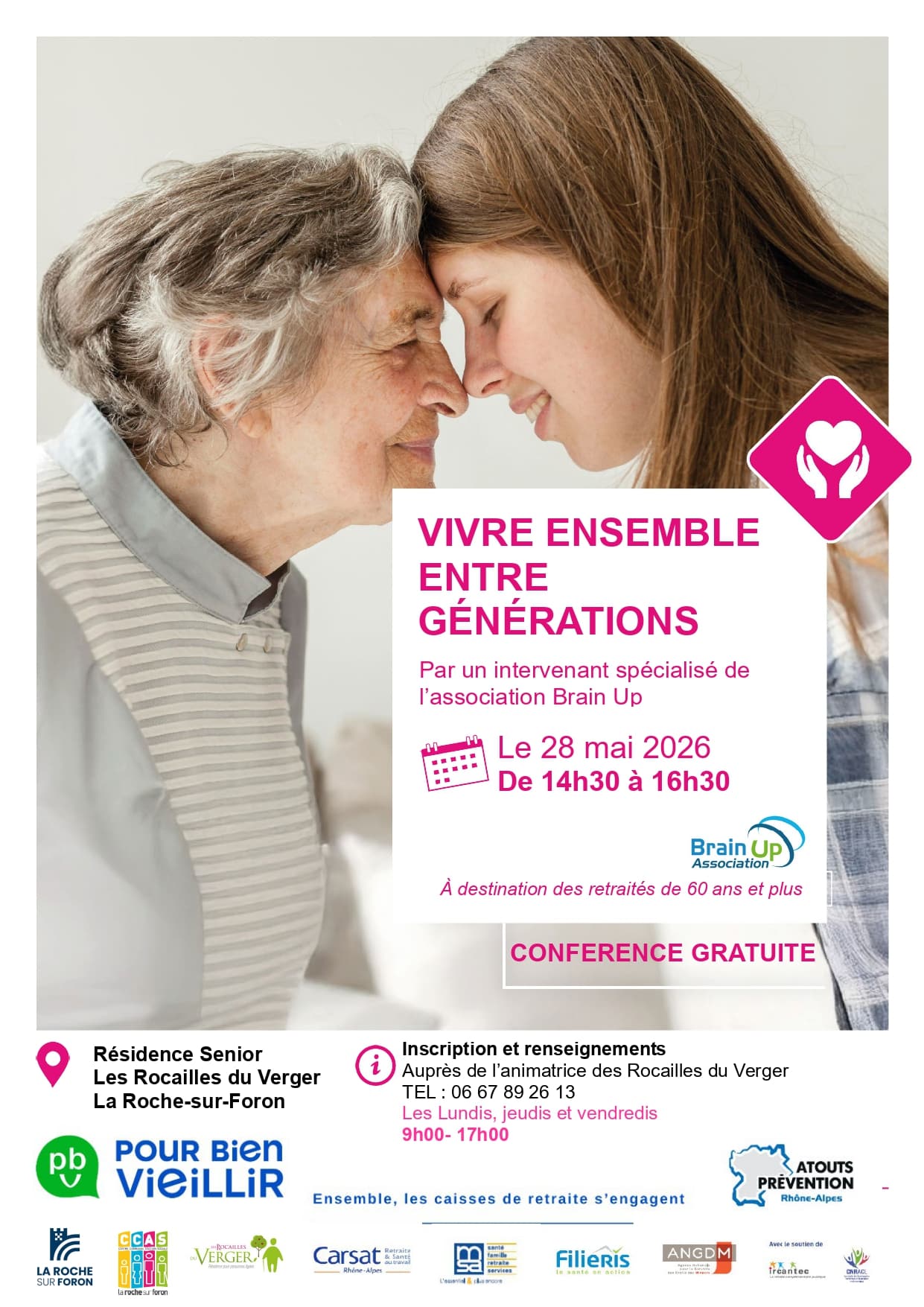 Cette conférence, proposée par le CCAS de La Roche-sur-Foron en partenariat avec la CARSAT et Brain Up Association, propose de mieux comprendre les relations intergénérationnelles et d’en valoriser les richesses.